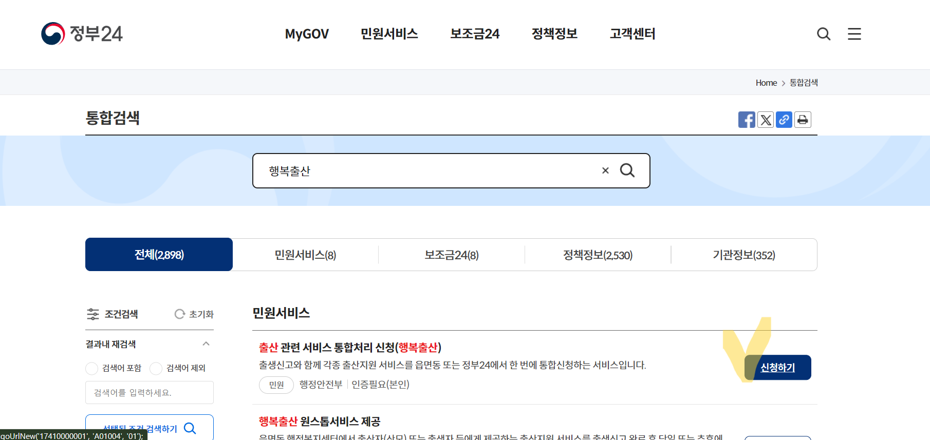 정부24 접속 후, 로그인 - 검색창에 '행복출산' 검색 - 출산관련 서비스 통합처리 신청하기 클릭 - 출산 및 의료비 지원, 주거지원, 양육 및 교육 지원 등 다양한 혜택을 신청할 수 있음.