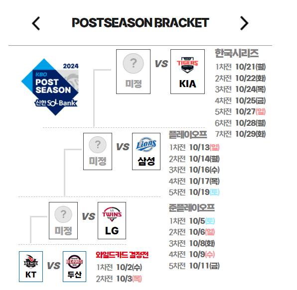 -일정: 2024년 KBO 포스트 시즌은 10월 2일날 치르는 5위 KT와 4위 두산의 와일드 카드 결정전으로 시작합니다.
