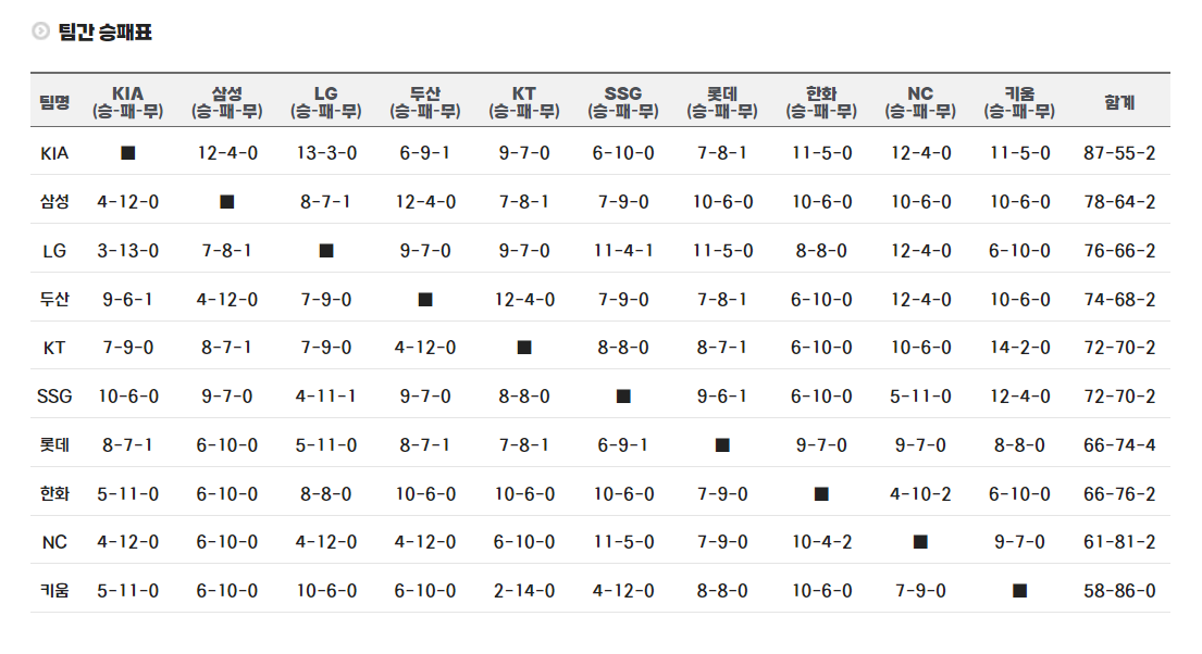 상대전적: KIA는 삼성에게 12승 4패, LG에게 13승 3패, 두산에게 6승 9패, KT에게 9승 7패를 기록했습니다.