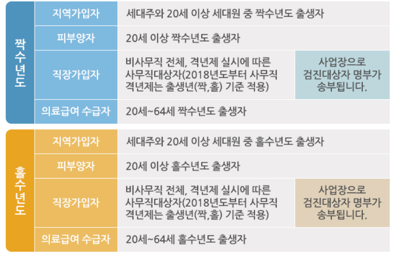대상자는 2년에 한 번씩 달라집니다. 보통 짝수년에 출생한 사람은 짝수년에, 홀수년에 출생한 사람은 홀수년에 검진 대상이 됩니다.