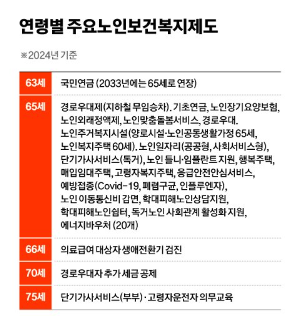 - 현재 제공되는 복지혜택: 65세 이상 노인에게 제공되는 복지혜택은 기초연금, 지하철 무임승차, 진료비 경감 등 20개 항목에 달합니다.