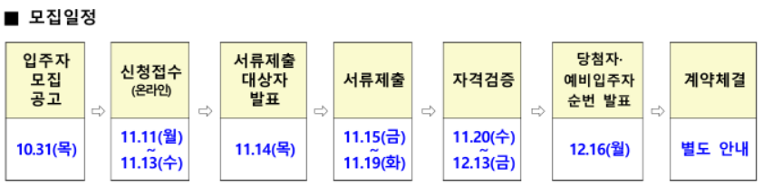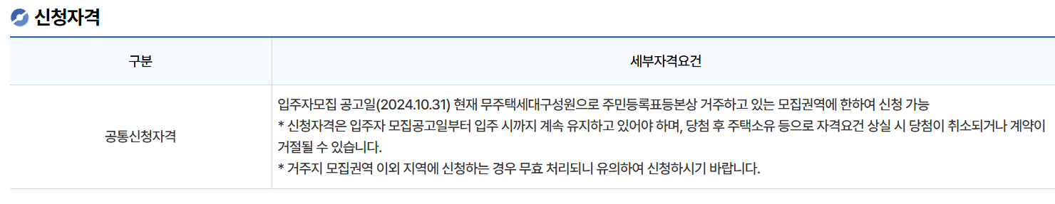 입주자 모집 공고일(10.31) 기준, 무주택세대 구성원이어야 하며 주민등록표등본상 거주하고 있는 모집권역에 한하여 신청 가능합니다.