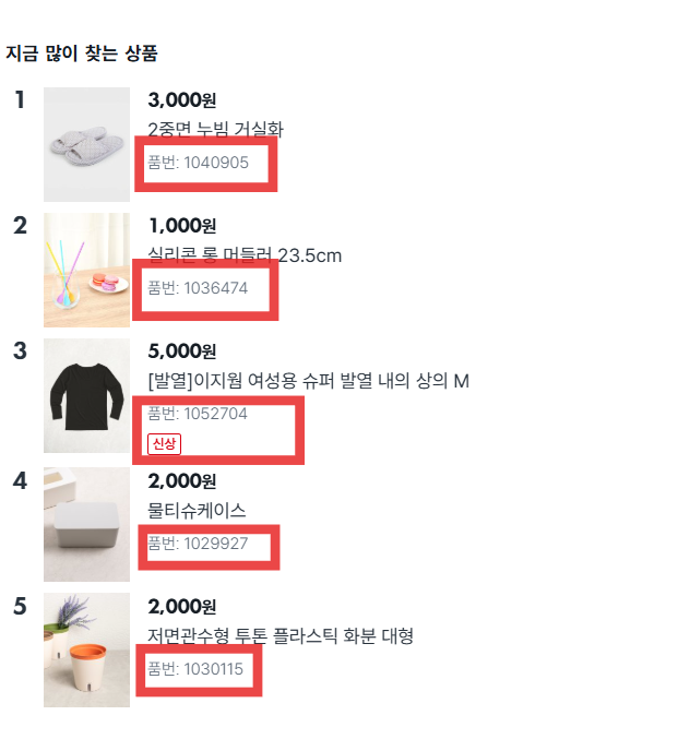 상품들의 품번을 안다면, 품번을 입력하여 검색하는 방법도 있습니다. 그러면 좀 더 정확하고 빠르게 제품의 제고를 확인할 수 있어요. 품번은 상품을 검색했을 때 아래와 같이 함께 볼 수 있는 일종의 코드입니다.