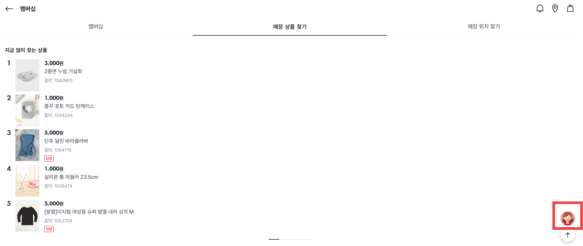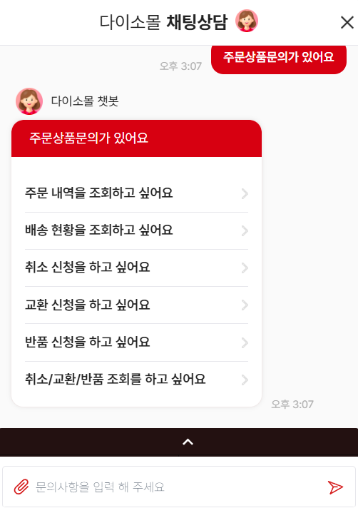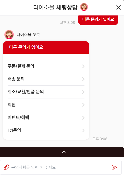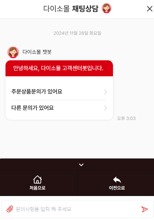 재고 확인 외에 상품에 대해 문의할 게 있다면, 다이소 챗봇을 이용해보세요. 이용하는 방법은 다음과 같습니다.