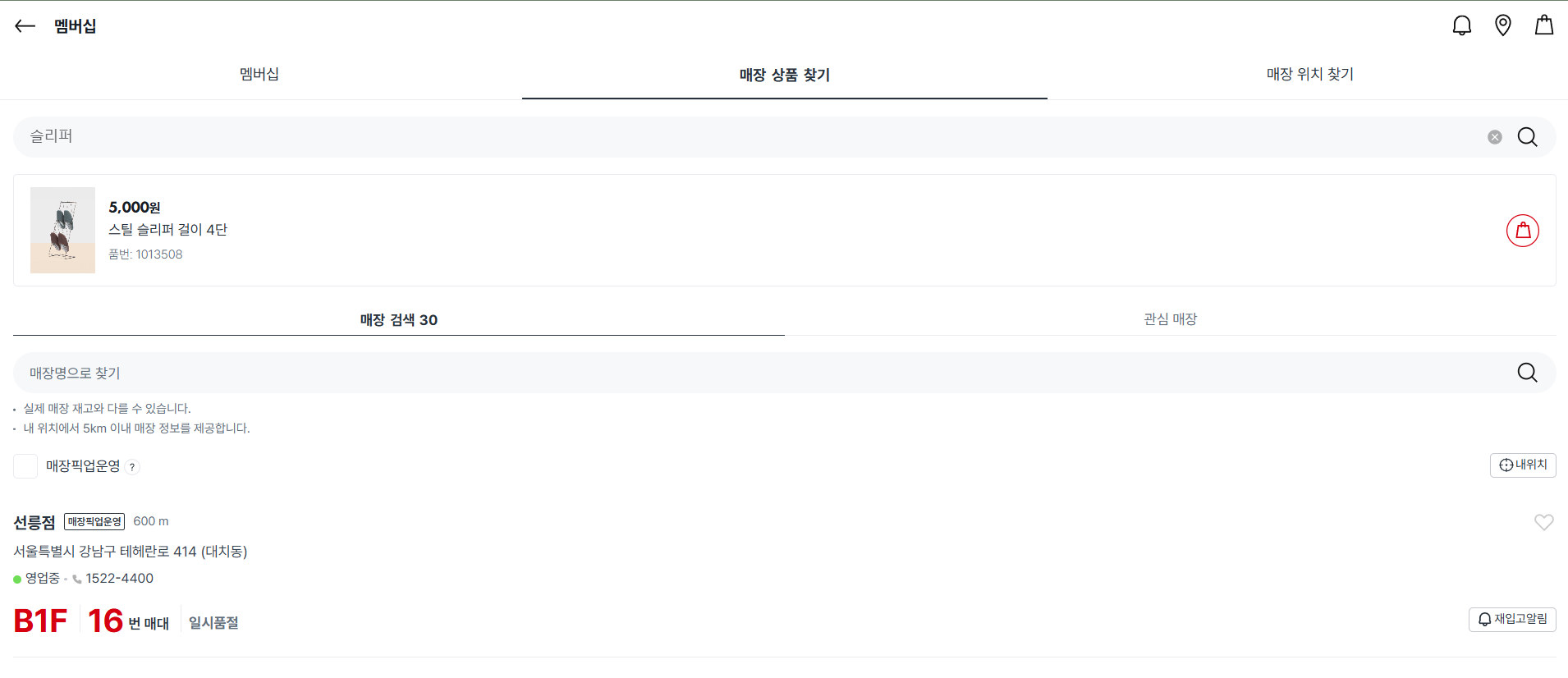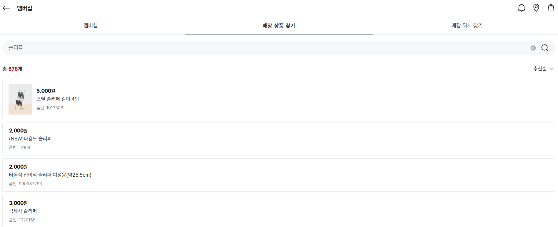 웹사이트에서 상품명을 검색해서 매장 상품을 찾을 수 있습니다. 예를들어, 검색창에 슬리퍼를 쳐보면 관련 상품들이 뜹니다.