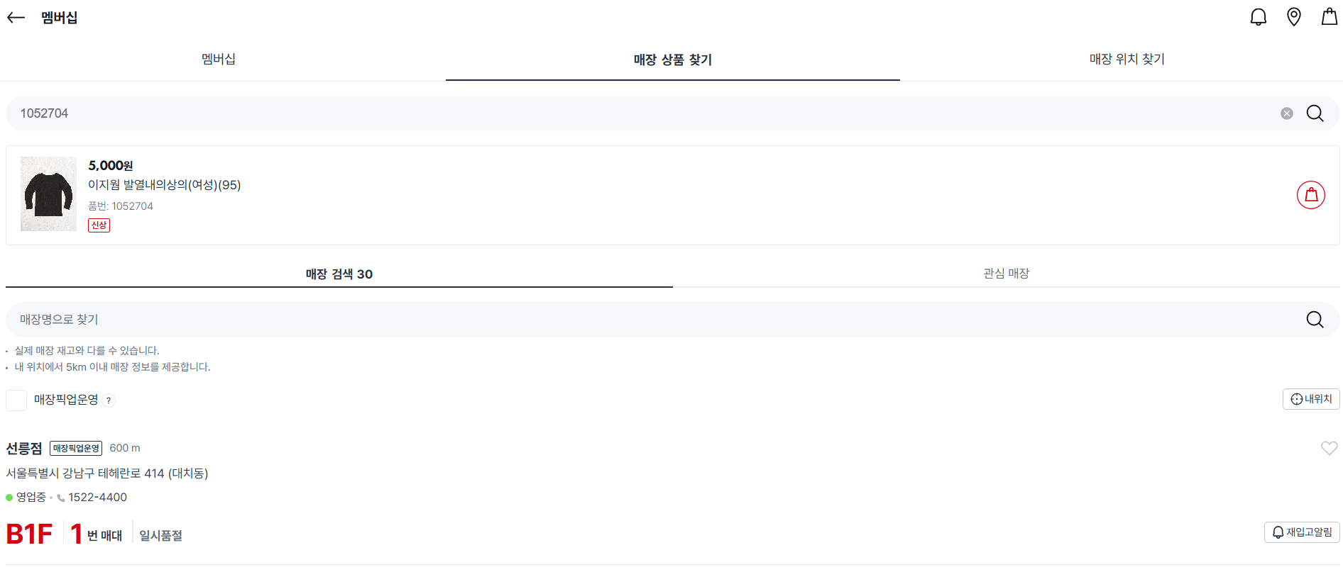 품번 입력으로 검색하면, 바로 내 주변 매장의 재고를 확인할 수 있어요. 주변 매장이 아닌 내가 확인하고 싶은 매장의 재고를 확인하고 싶으시다면, '매장명 찾기' 창에서 직접 매장명을 넣어 검색하시면 됩니다.