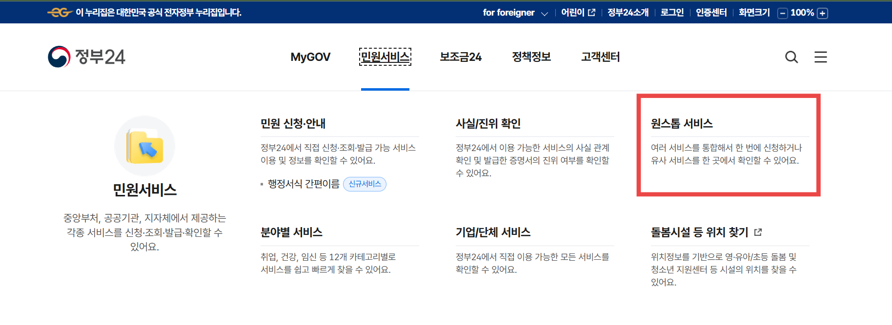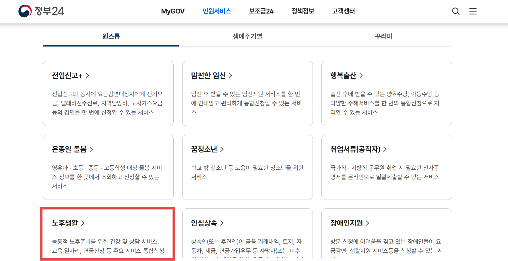정부 24 민원 서비스 메뉴 중, 원스톱 서비스를 클릭합니다.