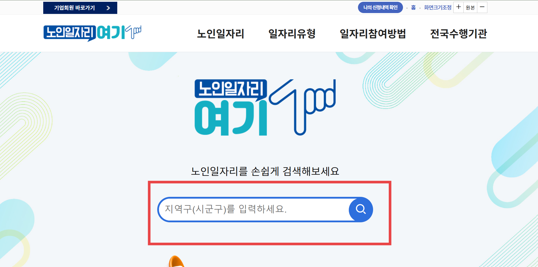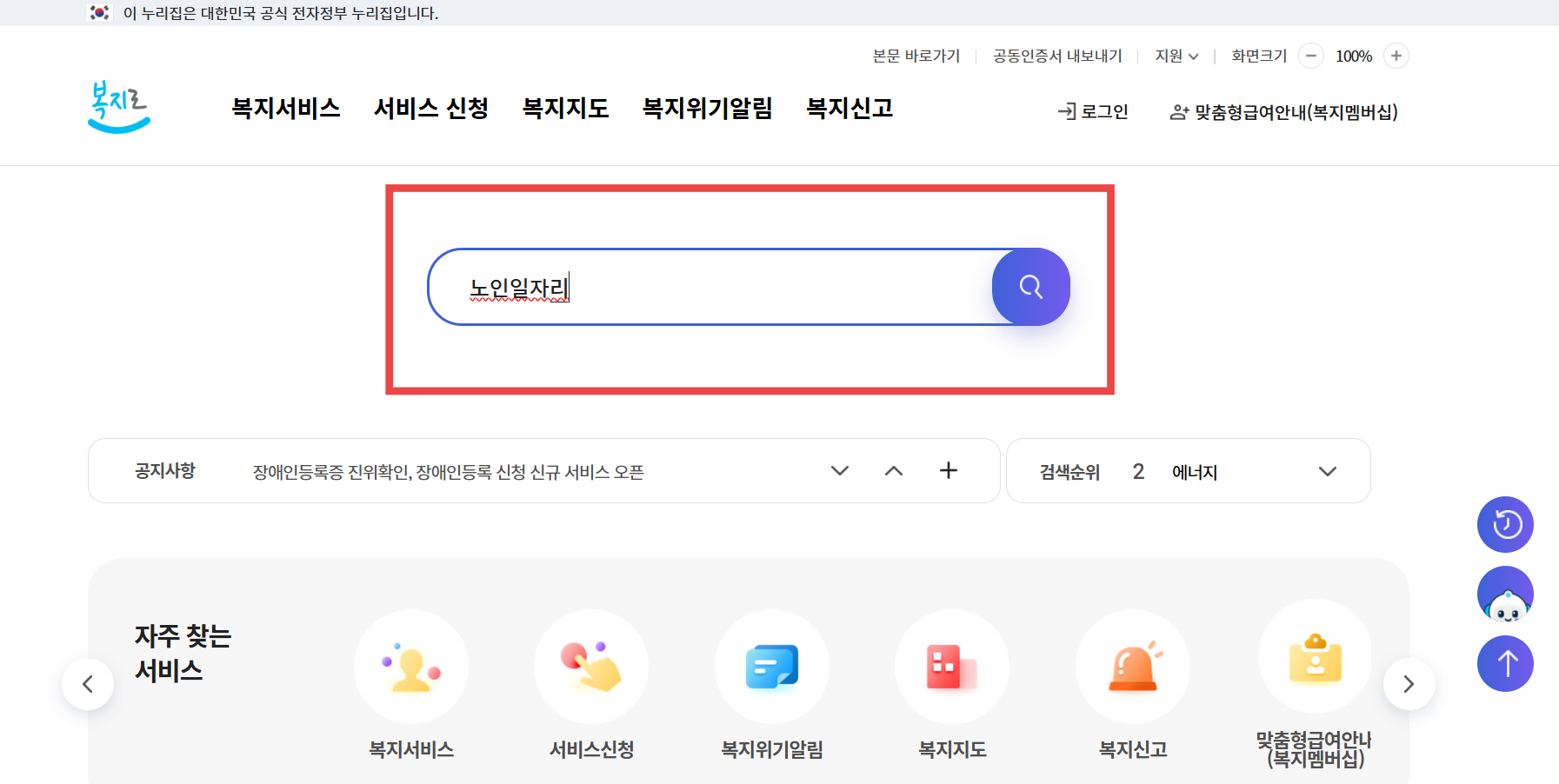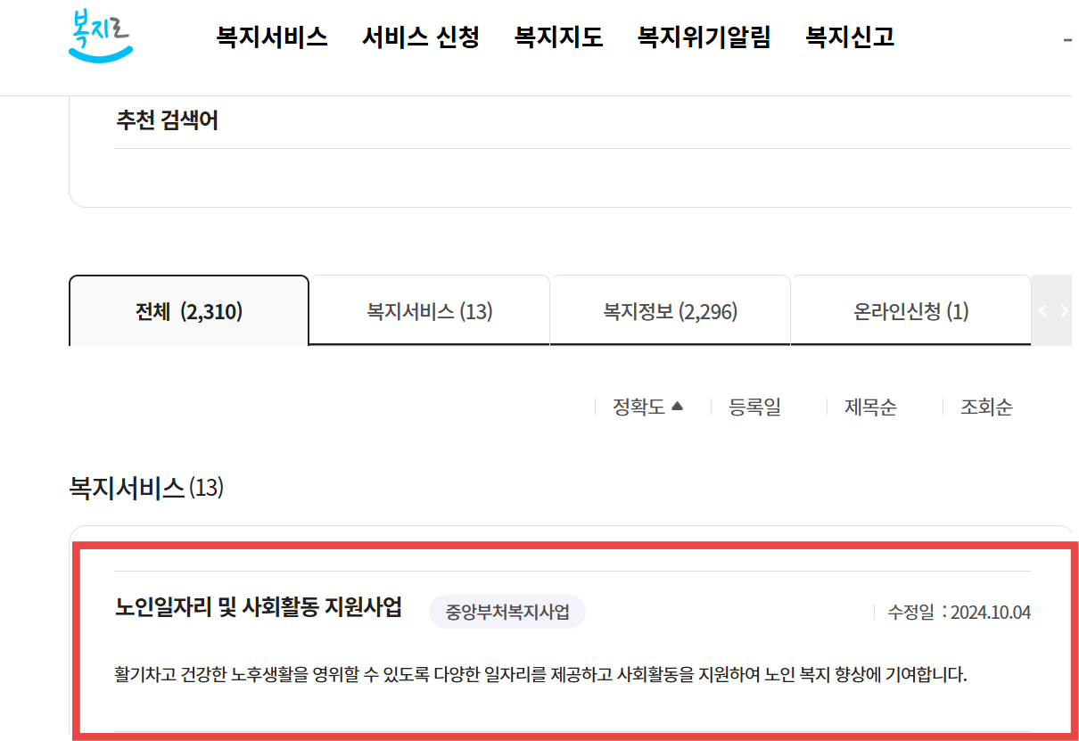 복지로 홈페이지의 검색창에 '노인일자리'라고 친 뒤에 검색해 보세요.