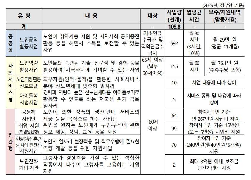 - 민간 부문 : 235,000개의 일자리가 제공되며, 다양한 민간 기업에서도 노인을 위한 일자리가 확대될 예정이에요.