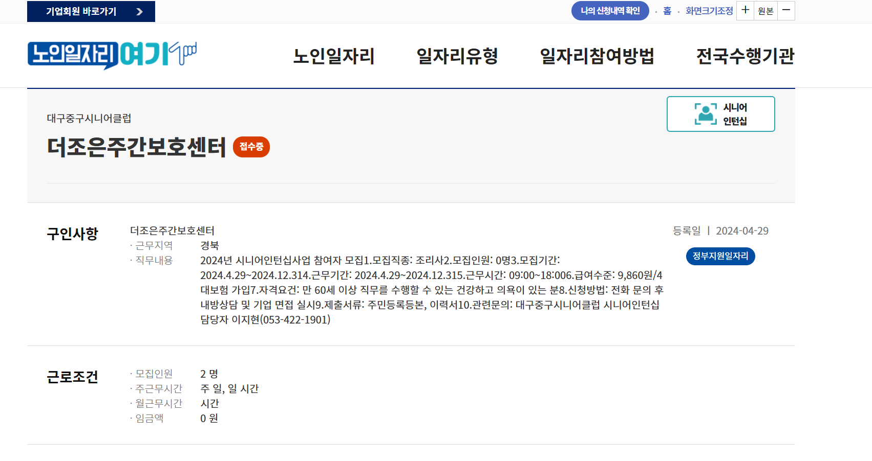 저는 대구광역시 중구를 클릭해 보겠습니다. 그러면 지역구에 지원할 수 있는 일자리들이 뜹니다. 관심 있는 일자리에 클릭해서 보시면 세부 내용을 확인하실 수 있고 일자리 정보 아래의 '지원하기' 버튼을 클릭하면 지원도 가능합니다.