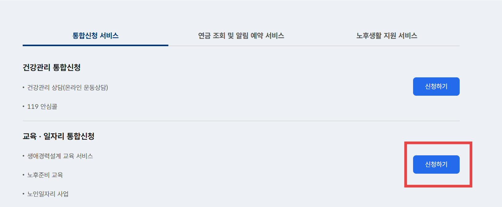 스크롤하여 죽 내리면, 아래와 같은 화면에서 교육·일자리 통합신청을 볼 수 있을 것입니다. 여기서 '신청하기'를 누르면 됩니다. 이런 사이트들은 로그인이 기본이고요. 간편 인증·모바일 인증이나 공동인증서, 금융인증서 모두 로그인 모두 가능하니 편한 방법으로 하시면 됩니다.