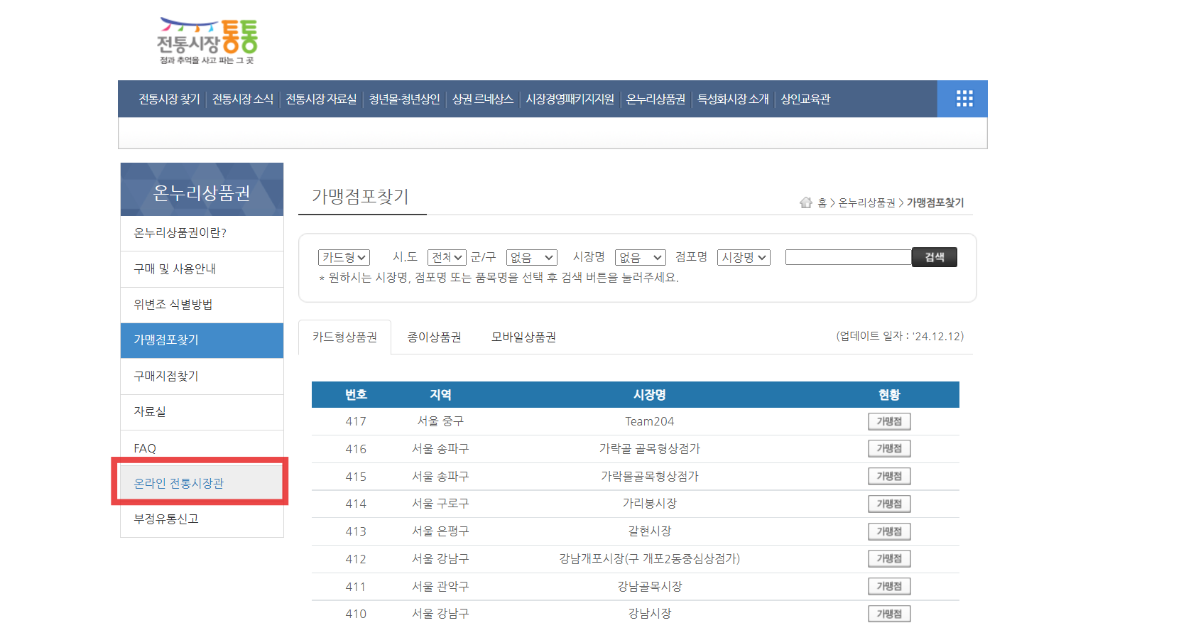 '전통시장 통통'사이트에 들어가 보시면, 온누리 상품권을 이용할 수 있는 가맹점포를 찾을 수 있습니다.