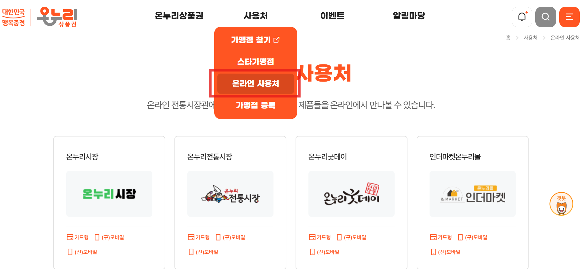 온누리 상품권 홈페이지 내에 사용처 메뉴에서 '온라인 사용처'를 클릭하면 온라인 온누리 상품권 몰들을 볼 수 있습니다.