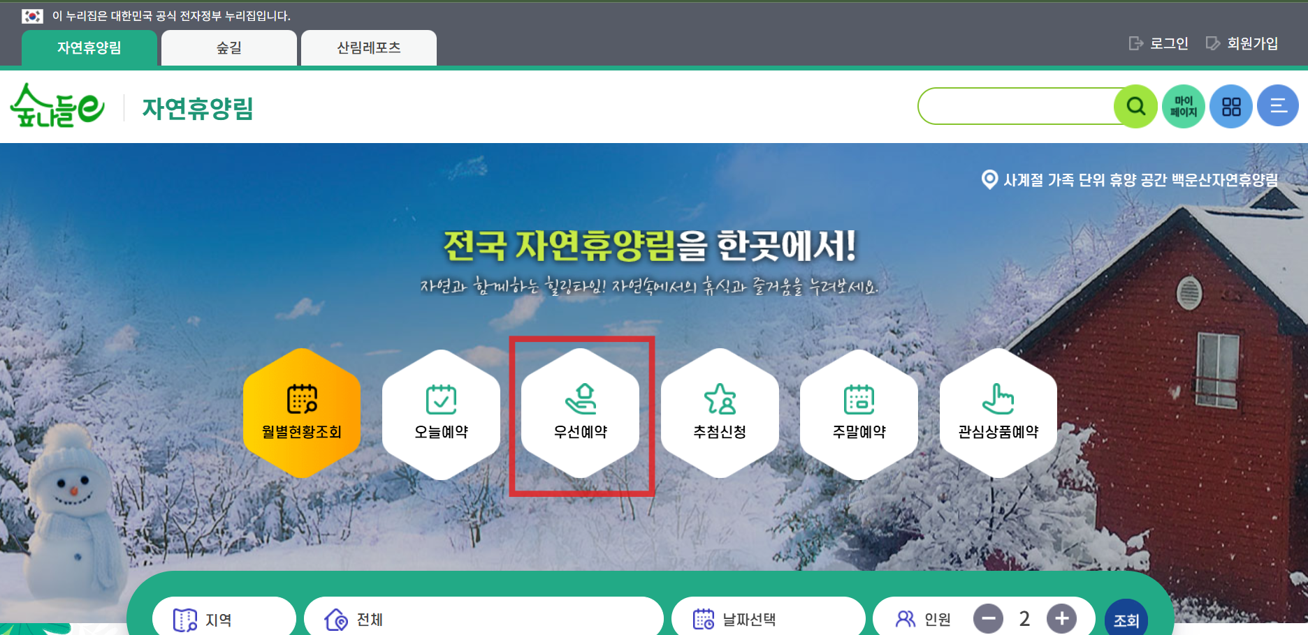 숲나들e 홈페이지에서 우선 예약 버튼을 누른 후, 로그인 후에 다자녀 혜택을 받아볼 수 있습니다.
