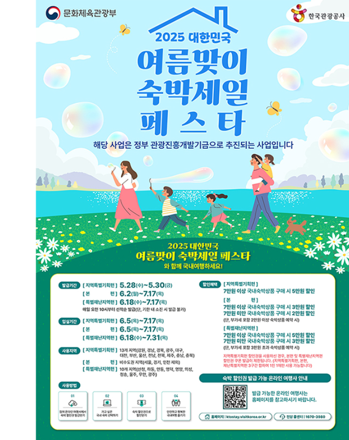 다가오는 여름, 알뜰한 국내 여행을 계획하고 있다면 ‘2025 대한민국 여름맞이 숙박세일페스타’를 주목해보세요. 문화체육관광부와 한국관광공사가 함께 준비한 이 행사는 숙박 할인권 40만 장을 제공하며, 전국 각지의 숙박비를 대폭 절감할 수 있는 절호의 기회입니다.