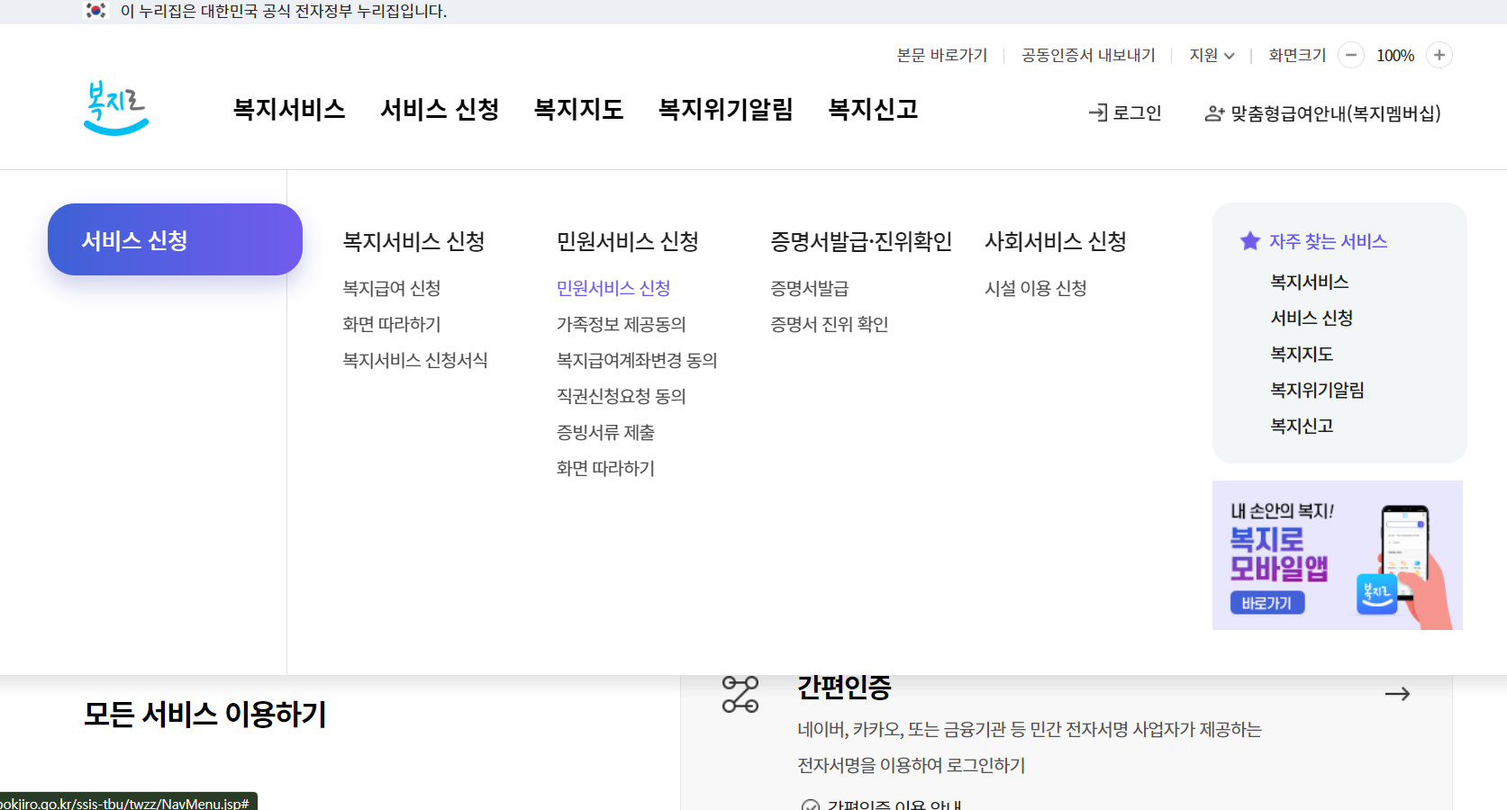 복지로 사이트에 가보시면 이용자의 편의에 맞춰 편하게 검색만 하면 쉽게 신청할 수 있게 되어 있습니다.
