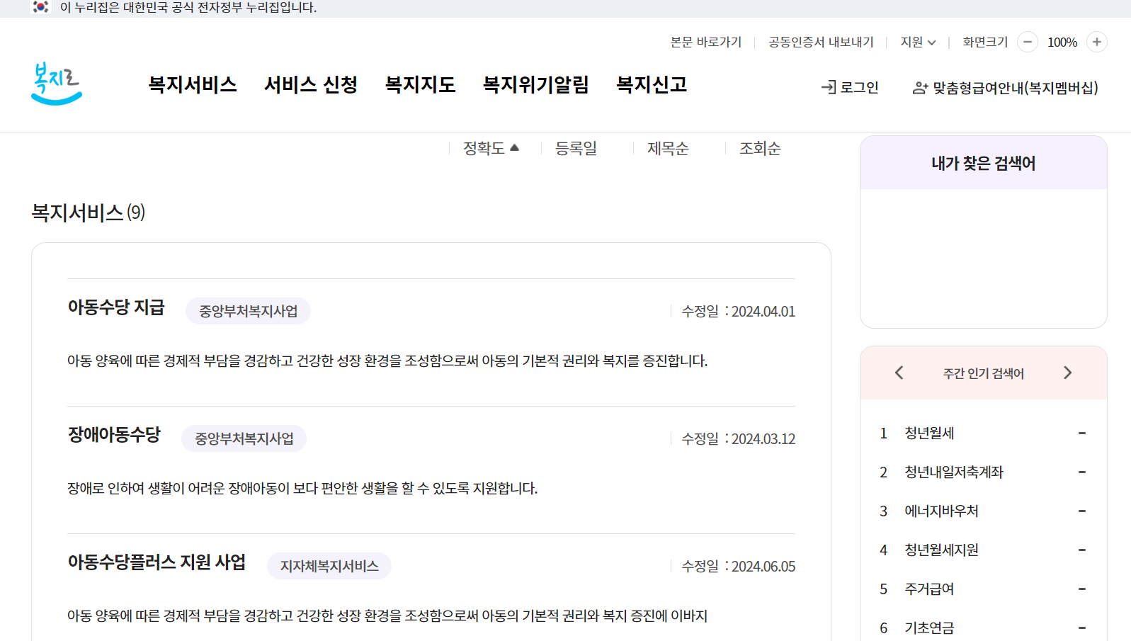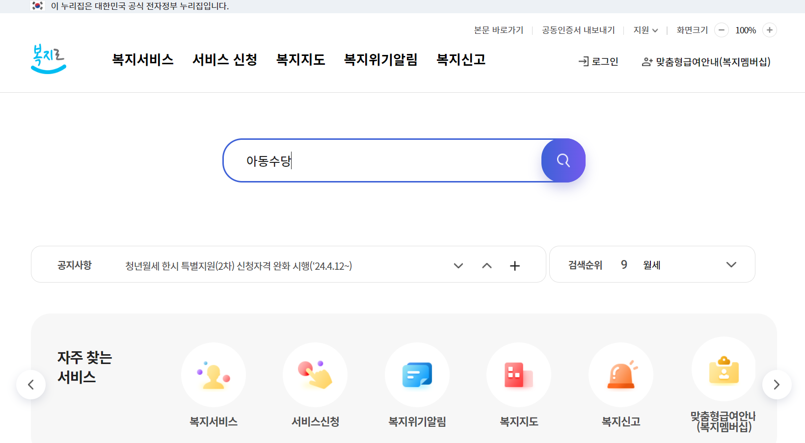 아래는 복지로 사이트에서 아동수당을 검색한 화면입니다.